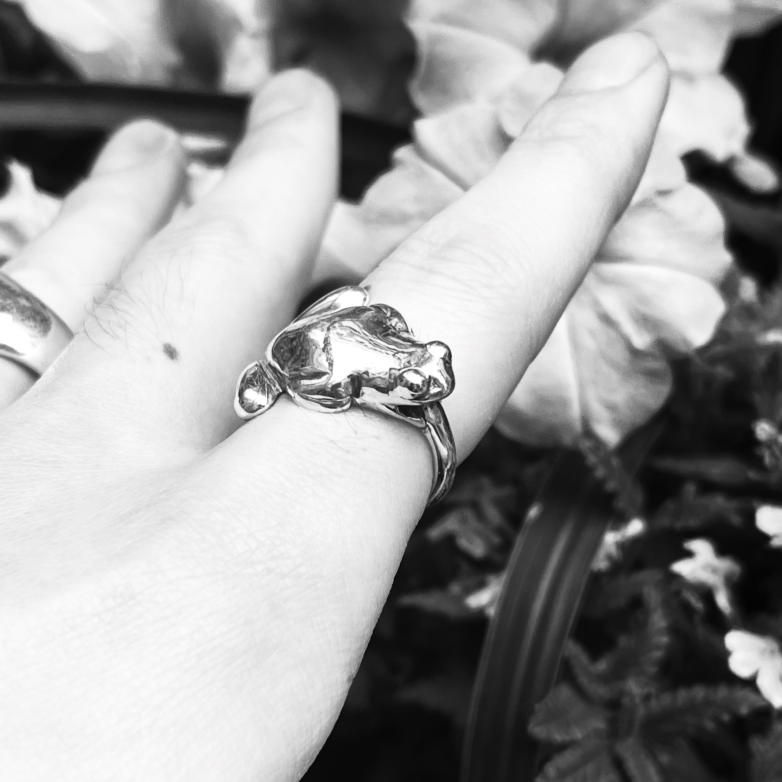 “roll tongue frog ring”は、舌を伸ばして獲物を捕まえるカエルをイメージしたリングです。